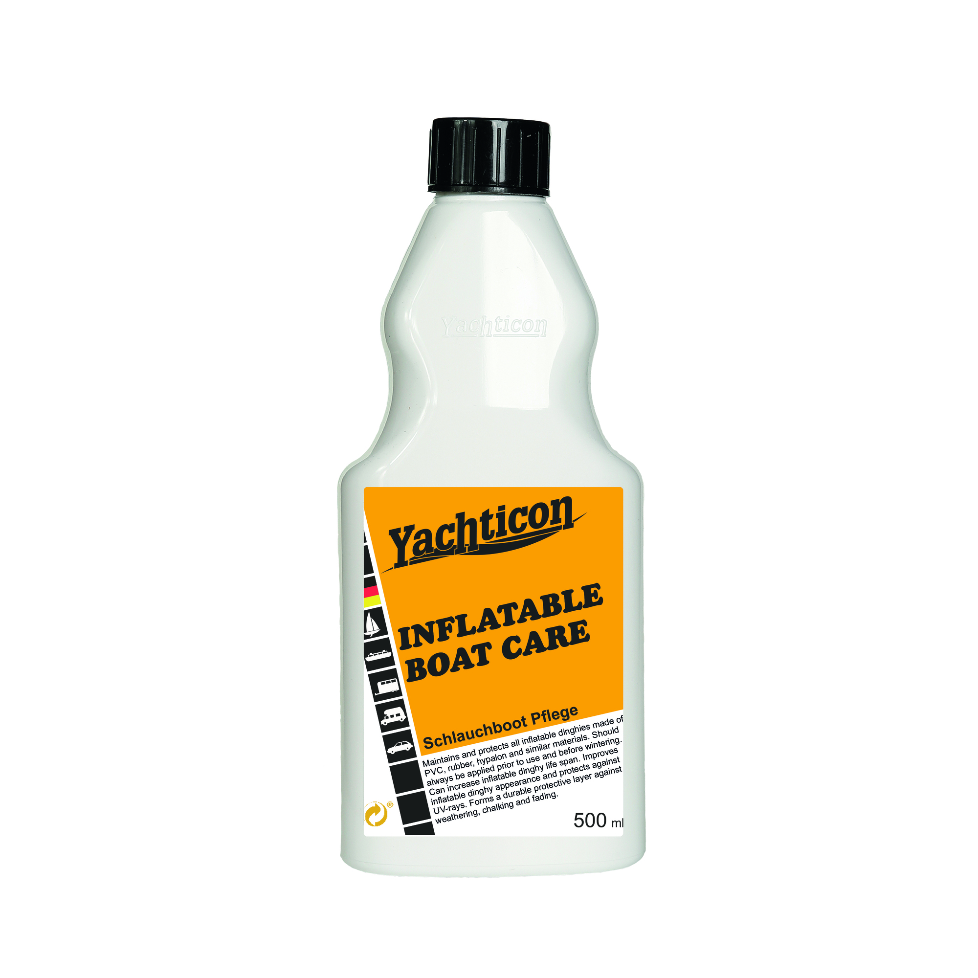 Yachticon inflatable boat care maintains and protects all inflatable boats made of PVC, rubber, Hypalon and similar materials. It should always be used after use and before winter storage. This increases the service life and improves the appearance.