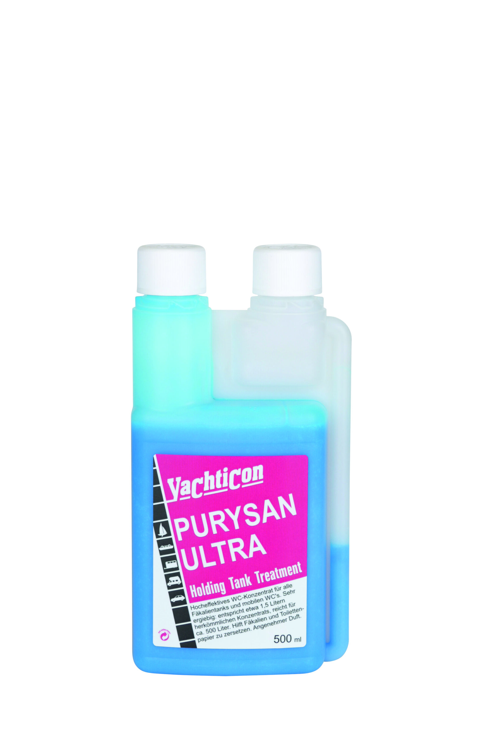 Application with outlet neck: Carefully open the cap. Pour the appropriate amount of YACHTICON PURYSAN into the tank. At high temperatures and long standing times, regularly add a little YACHTICON PURYSAN.